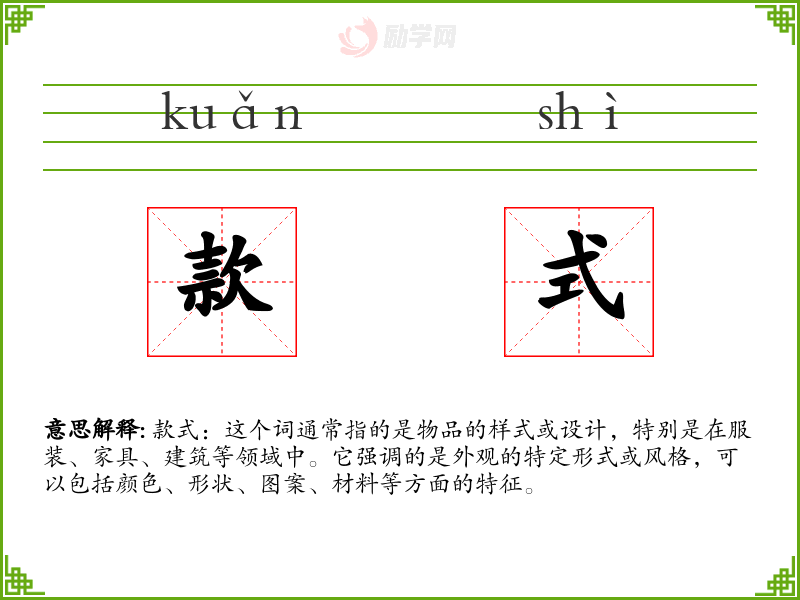 款式:这个词通常指的是物品的样式或设计,特别是在服装、家具、建筑等领域中。它强调的是外观的特定形式或风格,可以包括颜色、形状、图案、材料等方面的特征。