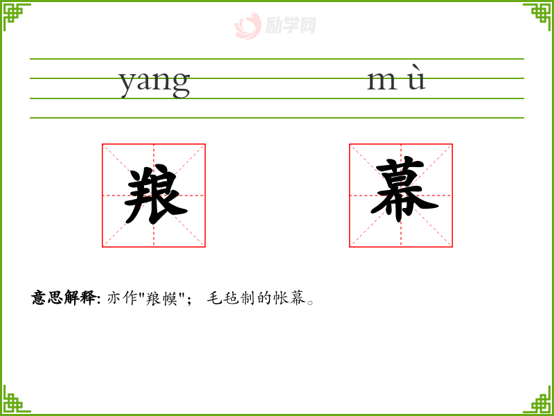 幕[ mù ] 1. (形声。从巾,莫声。本义:覆布,帐篷的顶布)。 2. 同本义。 【引证】 《说文》-幕,帷在上曰幕。 《谷梁传·定公十年》-舞于鲁君之幕下。 《左传·庄公二十八年》-楚幕有乌。 《左传·襄公二十九年》-夫子之在此也,犹燕之巢于幕上。 《战国策·齐策一》-举袂成幕。(袂:mèi:袖子) 【组词】 幕幕、 幕燕、 幕下 [更多解释]