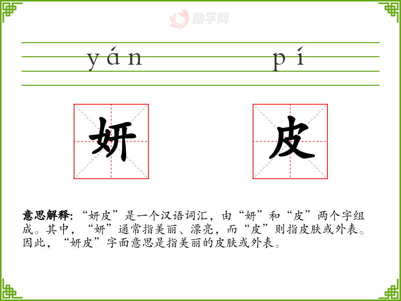 “妍皮”这个词在汉语中具有特定的文化内涵和美感,虽然在日常口语中不常用,但在文学和特定领域中仍有其独特的价值和意义。了解和掌握这样的词汇,有助于丰富语言表达和文化理解。