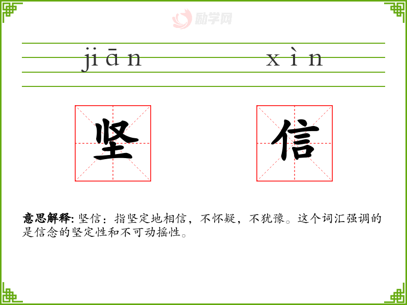 - 词源:“坚信”由“坚”和“信”两个字组成。“坚”意为坚固、稳定;“信”意为相信、信任。