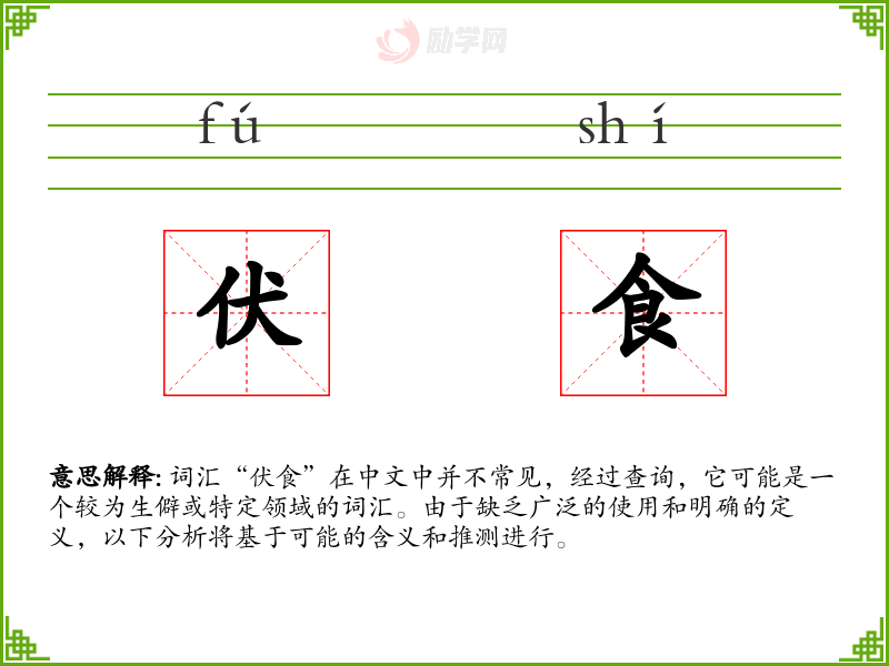 词汇“伏食”在中文中并不常见,经过查询,它可能是一个较为生僻或特定领域的词汇。由于缺乏广泛的使用和明确的定义,以下分析将基于可能的含义和推测进行。