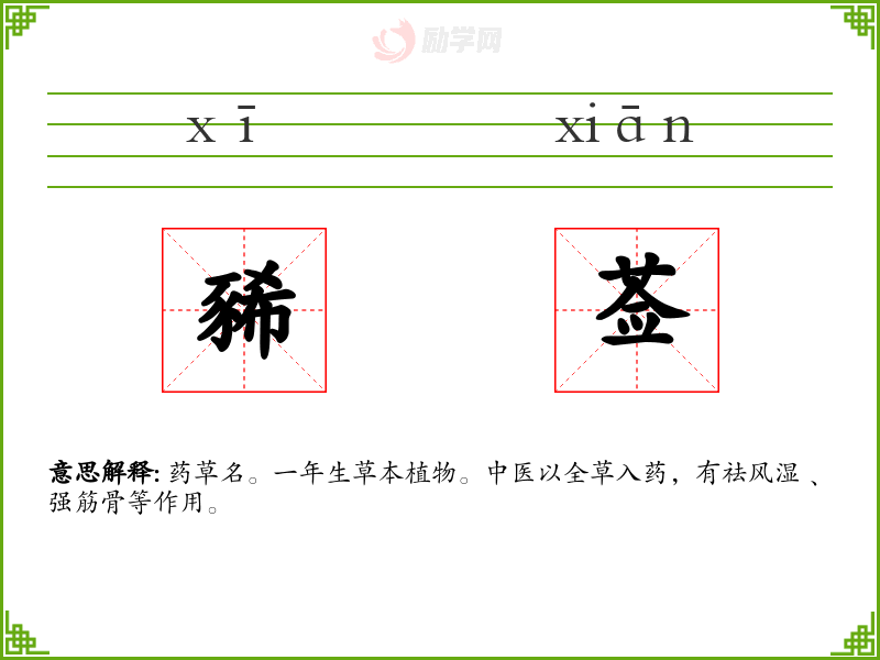 豨莶的意思是:药草名。一年生草本植物。中医以全草入药,有祛风湿﹑强筋骨等作用。
