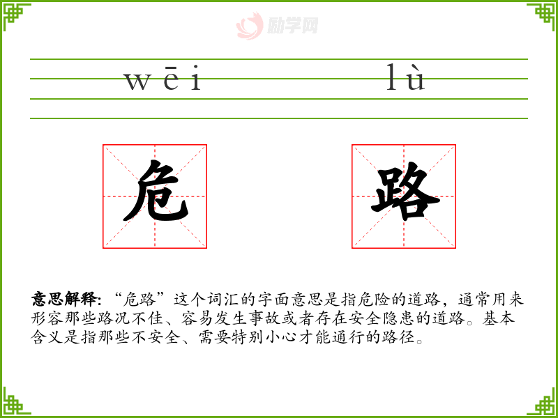 “危路”这个词汇的字面意思是指危险的道路,通常用来形容那些路况不佳、容易发生事故或者存在安全隐患的道路。基本含义是指那些不安全、需要特别小心才能通行的路径。