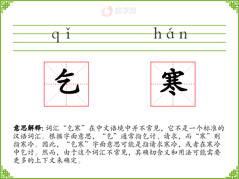 词汇“乞寒”在中文语境中并不常见,它不是一个标准的汉语词汇。根据字面意思,“乞”通常指乞讨、请求,而“寒”则指寒冷。因此,“乞寒”字面意思可能是指请求寒冷,或者在寒冷中乞讨。然而,由于这个词汇不常见,其确切含义和用法可能需要更多的上下文来确定。