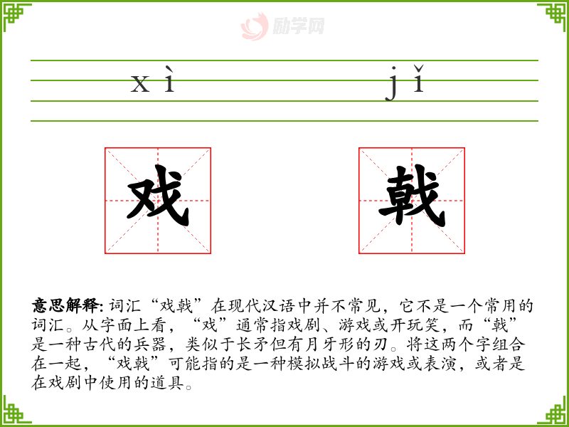 - 词源:“戏”和“戟”都是古代汉语词汇,组合起来可能是后来创造的词汇。