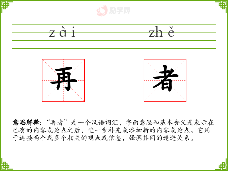 “再者”是一个汉语词汇,字面意思和基本含义是表示在已有的内容或论点之后,进一步补充或添加新的内容或论点。它用于连接两个或多个相关的观点或信息,强调其间的递进关系。