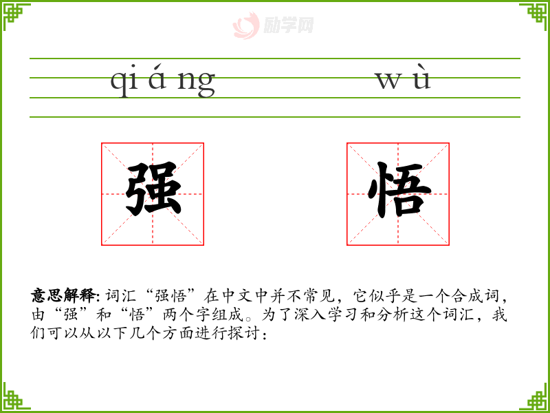 词汇“强悟”在中文中并不常见,它似乎是一个合成词,由“强”和“悟”两个字组成。为了深入学*和分析这个词汇,我们可以从以下几个方面进行探讨: