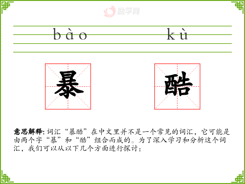 词汇“暴酷”在中文里并不是一个常见的词汇,它可能是由两个字“暴”和“酷”组合而成的。为了深入学习和分析这个词汇,我们可以从以下几个方面进行探讨: