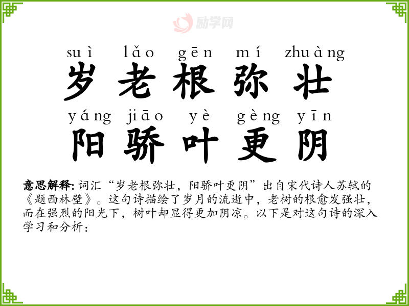 词汇“岁老根弥壮,阳骄叶更阴”出自宋代诗人苏轼的《题西林壁》。这句诗描绘了岁月的流逝中,老树的根愈发强壮,而在强烈的阳光下,树叶却显得更加阴凉。以下是对这句诗的深入学*和分析: