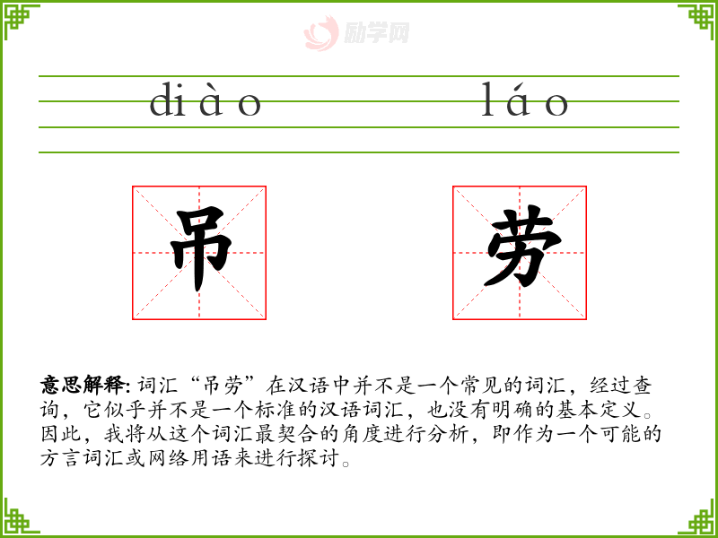 由于“吊劳”不是一个标准汉语词汇,我们无法给出确切的字面意思和基本含义。它可能是某个地区方言中的词汇,或者是网络用语中的一个表达。
