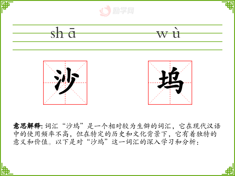 词汇“沙坞”是一个相对较为生僻的词汇,它在现代汉语中的使用频率不高,但在特定的历史和文化背景下,它有着独特的意义和价值。以下是对“沙坞”这一词汇的深入学*和分析: