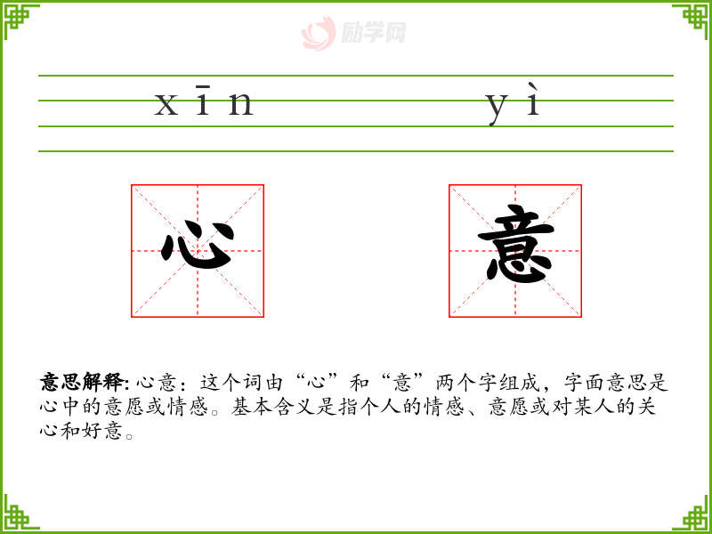 心意:这个词由“心”和“意”两个字组成,字面意思是心中的意愿或情感。基本含义是指个人的情感、意愿或对某人的关心和好意。