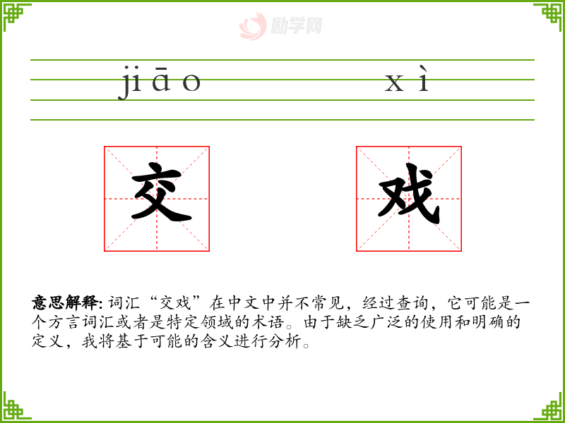 词汇“交戏”在中文中并不常见,经过查询,它可能是一个方言词汇或者是特定领域的术语。由于缺乏广泛的使用和明确的定义,我将基于可能的含义进行分析。
