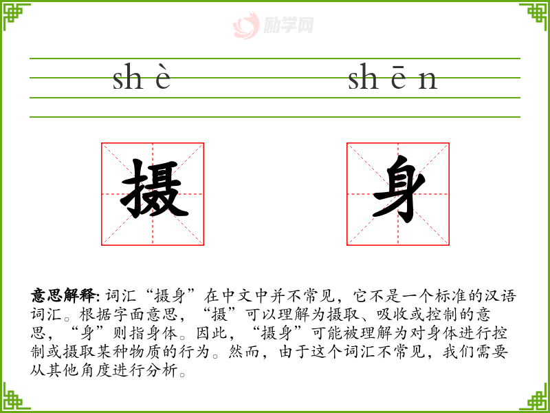由于“摄身”不是一个标准词汇,我们无法给出一个确切的基本定义。它可能是某个特定领域或方言中的词汇,或者是某个特定文献中的创造性用法。