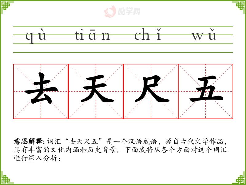 词汇“去天尺五”是一个汉语成语,源自古代文学作品,具有丰富的文化内涵和历史背景。下面我将从各个方面对这个词汇进行深入分析: