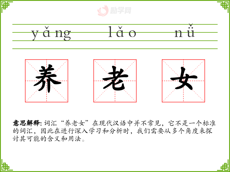 - 反义词:无,因为“养老女”不是一个标准词汇,所以很难找到直接的反义词。