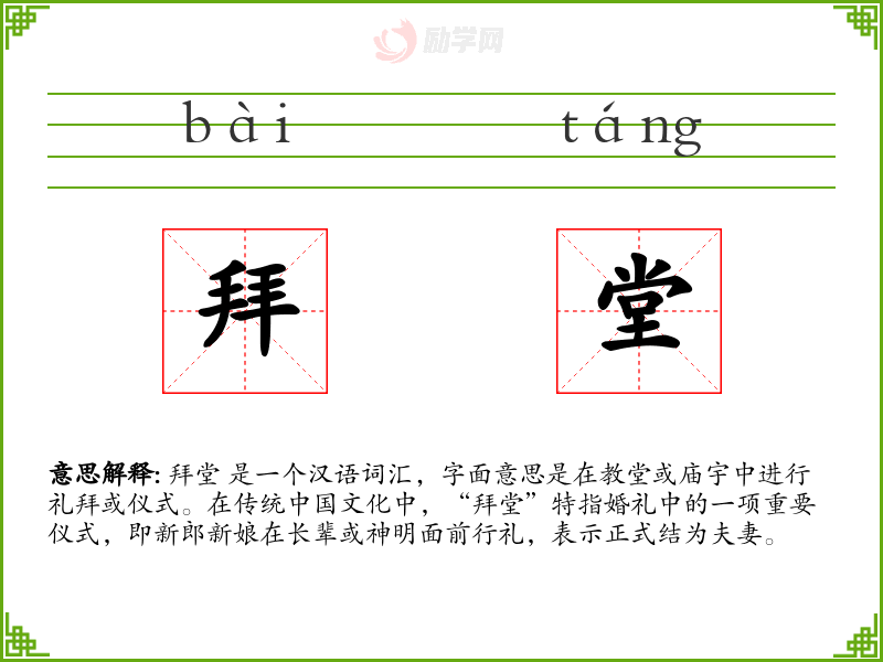 “拜堂”一词往往带有一种庄重和神圣的情感,让人联想到传统婚礼的喜庆和祝福。它也反映了人们对婚姻的尊重和对未来的美好期待。