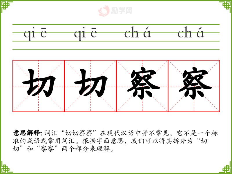 词汇“切切察察”在现代汉语中并不常见,它不是一个标准的成语或常用词汇。根据字面意思,我们可以将其拆分为“切切”和“察察”两个部分来理解。