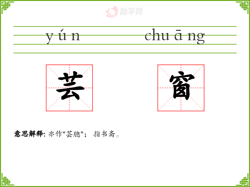 芸窗的意思是:亦作"芸牕"; 指书斋。