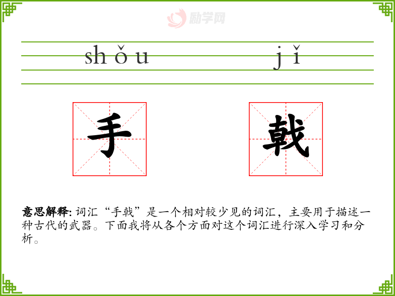词汇“手戟”是一个相对较少见的词汇,主要用于描述一种古代的武器。下面我将从各个方面对这个词汇进行深入学习和分析。