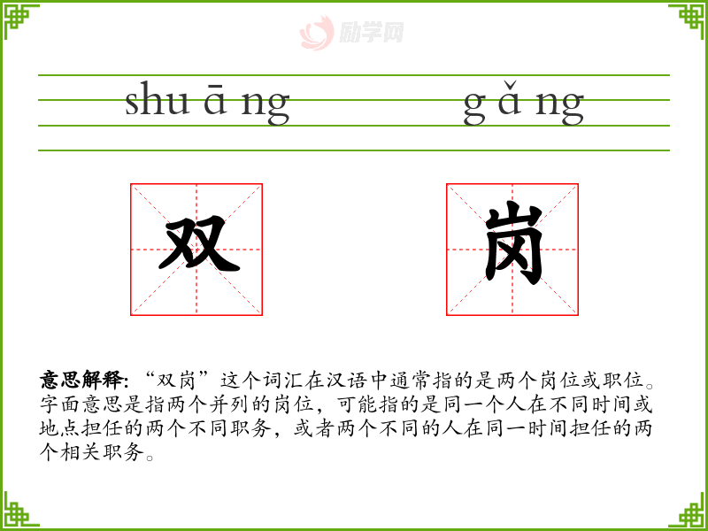 - 口语:在日常对话中,“双岗”可能指的是一个人同时做两份工作,或者在同一时间段内负责两个不同的任务。