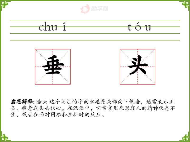 垂头 这个词汇的字面意思是头部向下低垂,通常表示沮丧、疲惫或失去信心。在汉语中,它常常用来形容人的精神状态不佳,或者在面对困难和挫折时的反应。