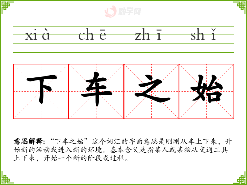 “下车之始”这个词汇的字面意思是刚刚从车上下来,开始新的活动或进入新的环境。基本含义是指某人或某物从交通工具上下来,开始一个新的阶段或过程。