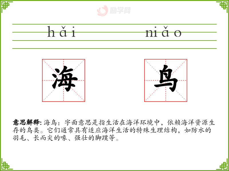 海鸟的意思是:在海岛上或海边生长﹑栖息的鸟类。