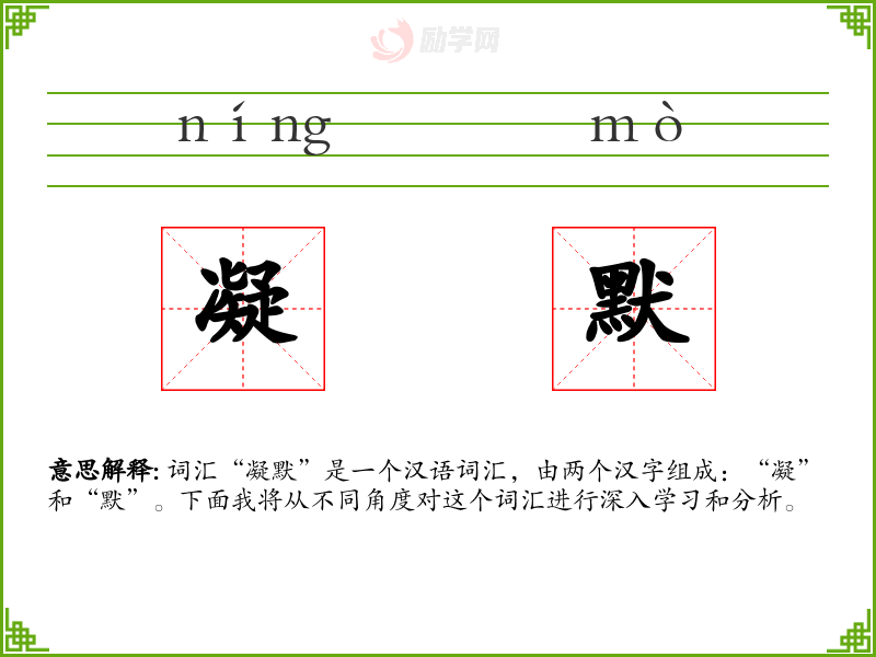 词汇“凝默”是一个汉语词汇,由两个汉字组成:“凝”和“默”。下面我将从不同角度对这个词汇进行深入学*和分析。