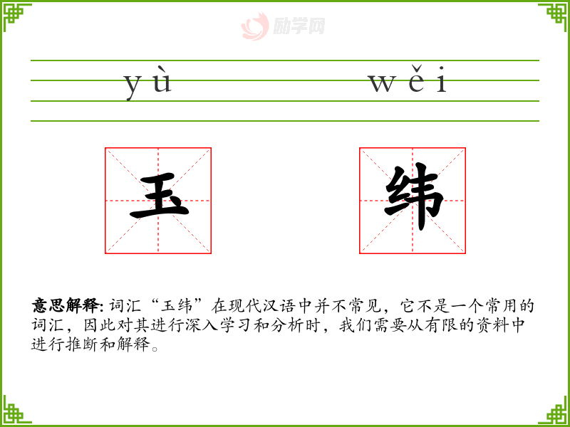 词汇“玉纬”在现代汉语中并不常见,它不是一个常用的词汇,因此对其进行深入学*和分析时,我们需要从有限的资料中进行推断和解释。