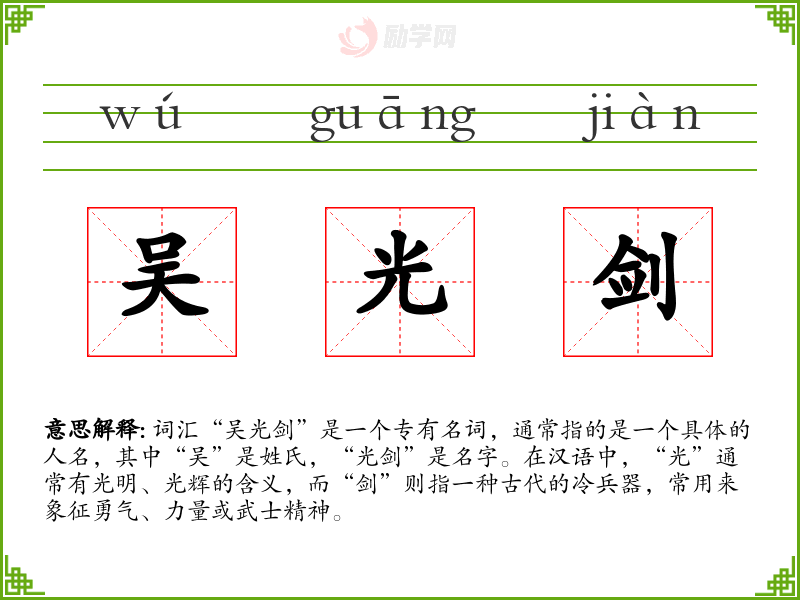 - 词源:“吴”是一个古老的姓氏,源自古代的吴国;“光剑”作为名字,可能是父母希望孩子像光一样明亮,像剑一样坚强。