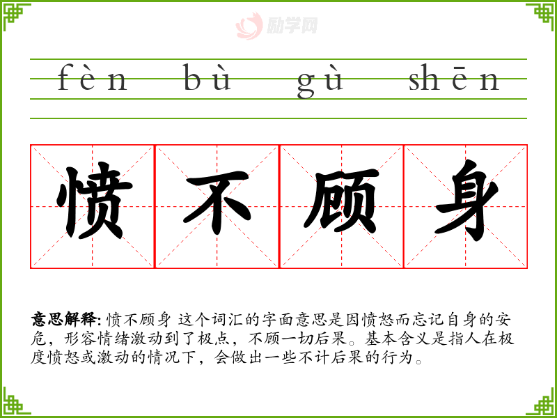 愤不顾身 这个词汇的字面意思是因愤怒而忘记自身的安危,形容情绪激动到了极点,不顾一切后果。基本含义是指人在极度愤怒或激动的情况下,会做出一些不计后果的行为。