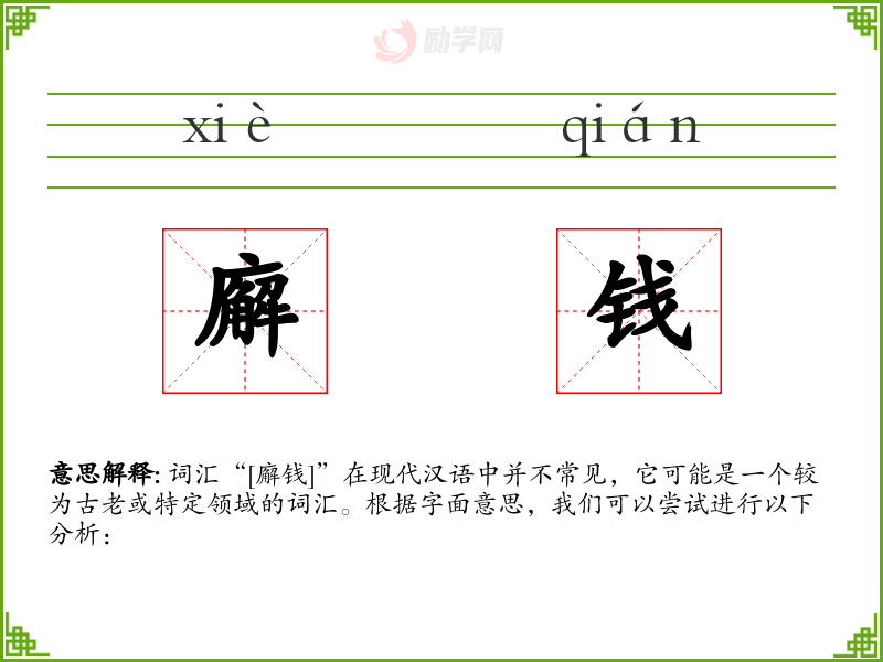 词汇“[廨钱]”在现代汉语中并不常见,它可能是一个较为古老或特定领域的词汇。根据字面意思,我们可以尝试进行以下分析: