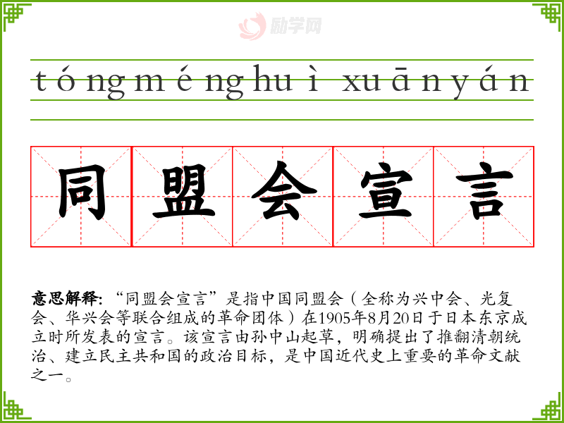 1.同盟会宣言的拼音是什么?同盟会宣言怎么读?