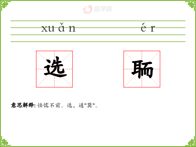选聏的意思是:怯懦不前。选,通"巽"。