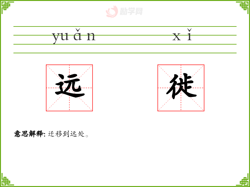 《说文》-远,辽也。 《尔雅》-远,遐也。 《礼记·王制》。注:“九州之外也。”-屏之远方。 《礼记·中庸》-柔远人也。 《礼记·乐记》-穷高极远。 《战国策·赵策》-念悲其远。 《左传·僖公三十三年》-远主备之,无乃不可乎? 《左传·三十三年》-劳师以袭远,非所闻也。 唐·杜牧《阿房宫赋》-缦立远视。 清·徐珂《清稗类钞·战事类》-火器利袭远,技击利巷战。 《广东军务记》-极目远望。