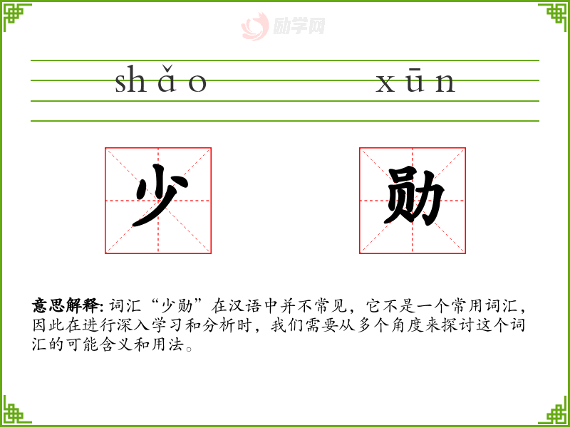 词汇“少勋”在汉语中并不常见,它不是一个常用词汇,因此在进行深入学*和分析时,我们需要从多个角度来探讨这个词汇的可能含义和用法。