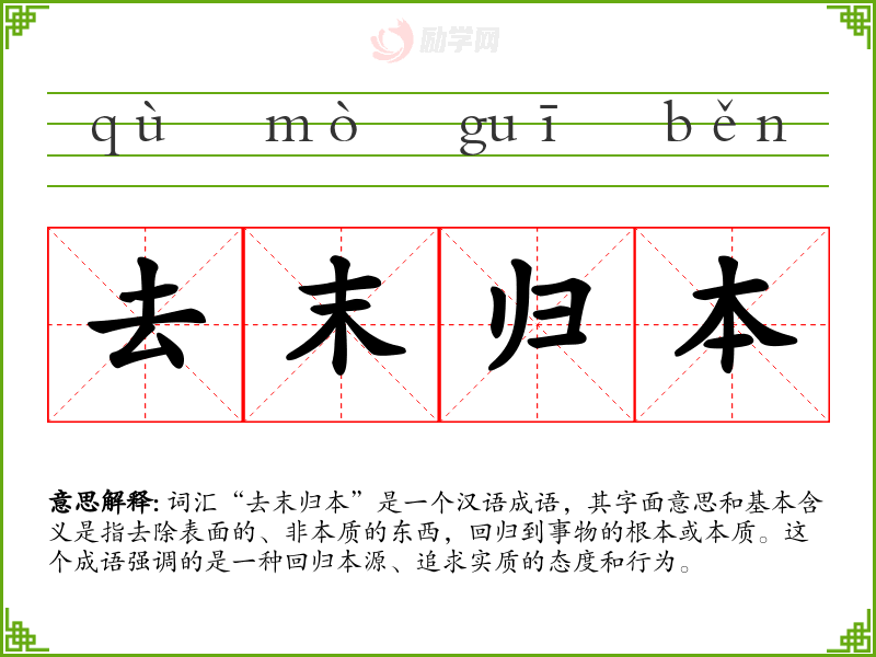 通过对“去末归本”这个成语的学和分析,我更加深刻地理解了追求事物本质的重要性。在语言学和表达中,这个成语提醒我要有深入思考的*惯,不被表面现象所迷惑。