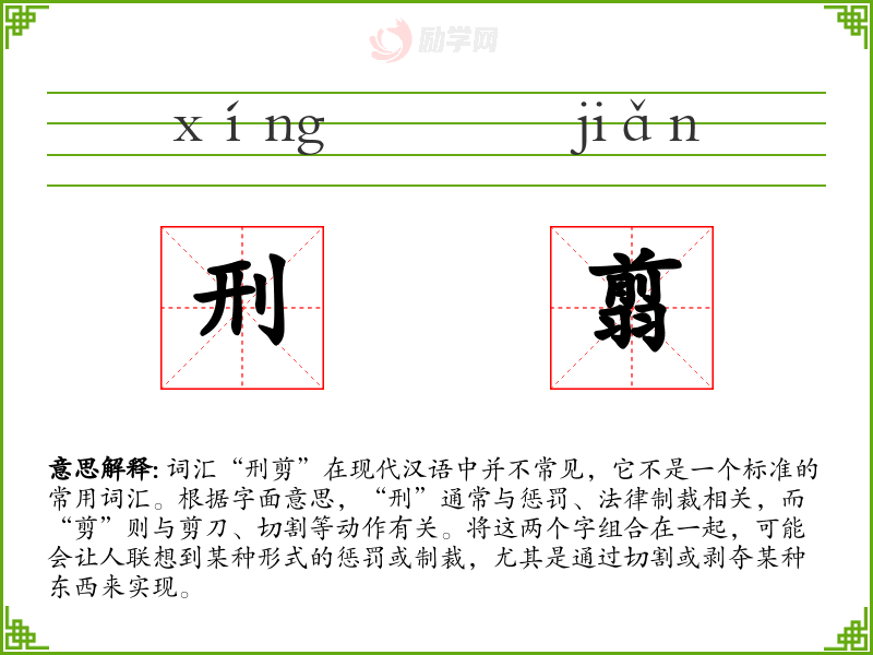 - 刑剪:可能指的是一种通过切割或剥夺来实施的惩罚手段。