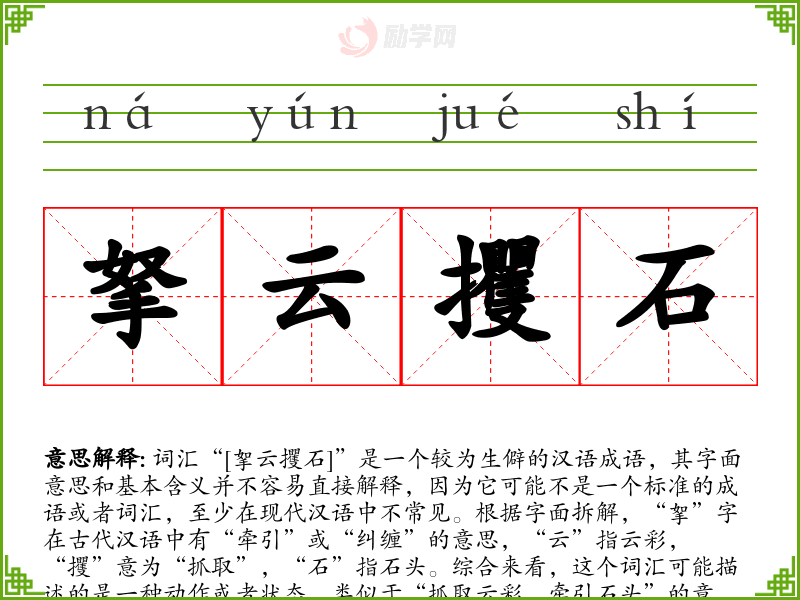 词汇“[挐云攫石]”是一个较为生僻的汉语成语,其字面意思和基本含义并不容易直接解释,因为它可能不是一个标准的成语或者词汇,至少在现代汉语中不常见。根据字面拆解,“挐”字在古代汉语中有“牵引”或“纠缠”的意思,“云”指云彩,“攫”意为“抓取”,“石”指石头。综合来看,这个词汇可能描述的是一种动作或者状态,类似于“抓取云彩,牵引石头”的意象,可能用来形容某种力量巨大或者行为异常。