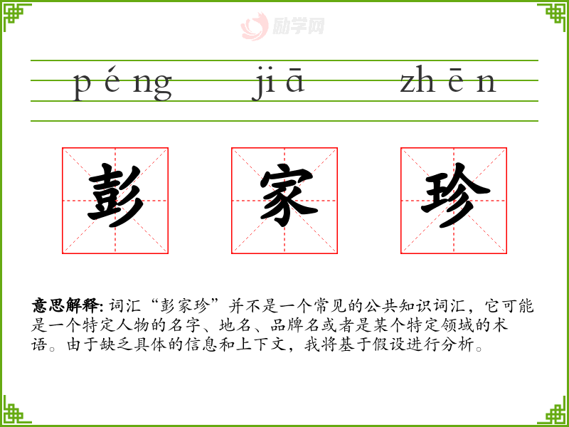 由于“彭家珍”的具体含义不明确,对其的理解和应用需要更多的上下文信息。在语言学*和表达中,了解词汇的具体含义和用法是非常重要的。
