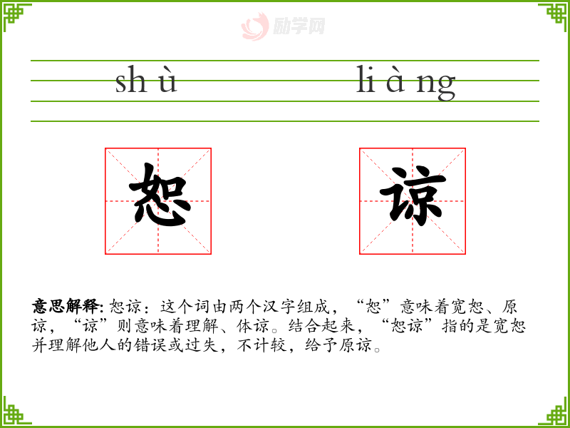 恕谅:这个词由两个汉字组成,“恕”意味着宽恕、原谅,“谅”则意味着理解、体谅。结合起来,“恕谅”指的是宽恕并理解他人的错误或过失,不计较,给予原谅。
