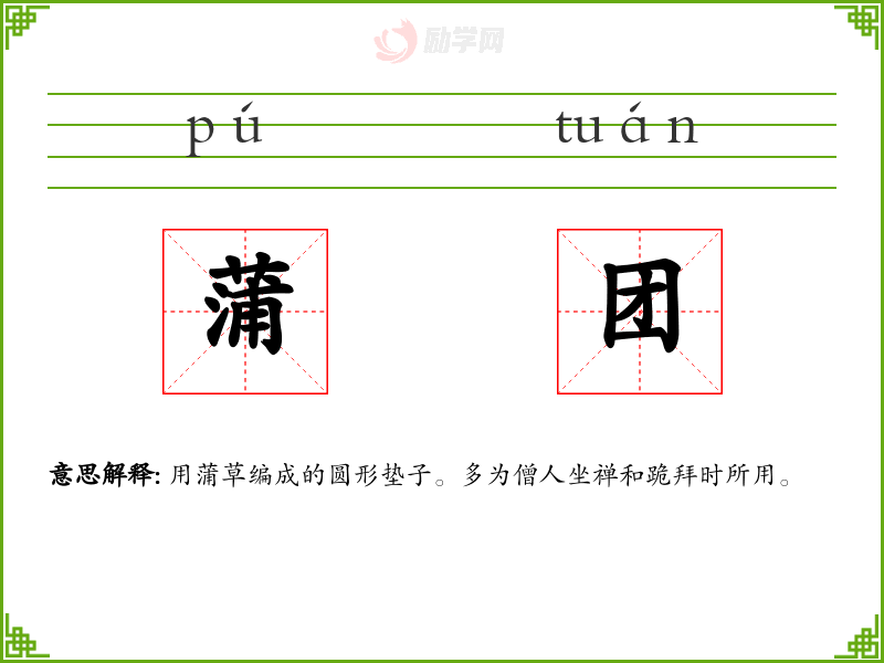 蒲团的意思是:用蒲草编成的圆形垫子。多为僧人坐禅和跪拜时所用。