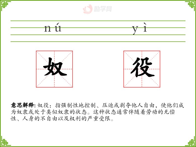 - 专业领域:在历史学、社会学和法律学中,“奴役”特指历史上的一种社会制度,即奴隶制度。