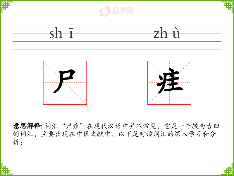 词汇“尸疰”在现代汉语中并不常见,它是一个较为古旧的词汇,主要出现在中医文献中。以下是对该词汇的深入学*和分析: