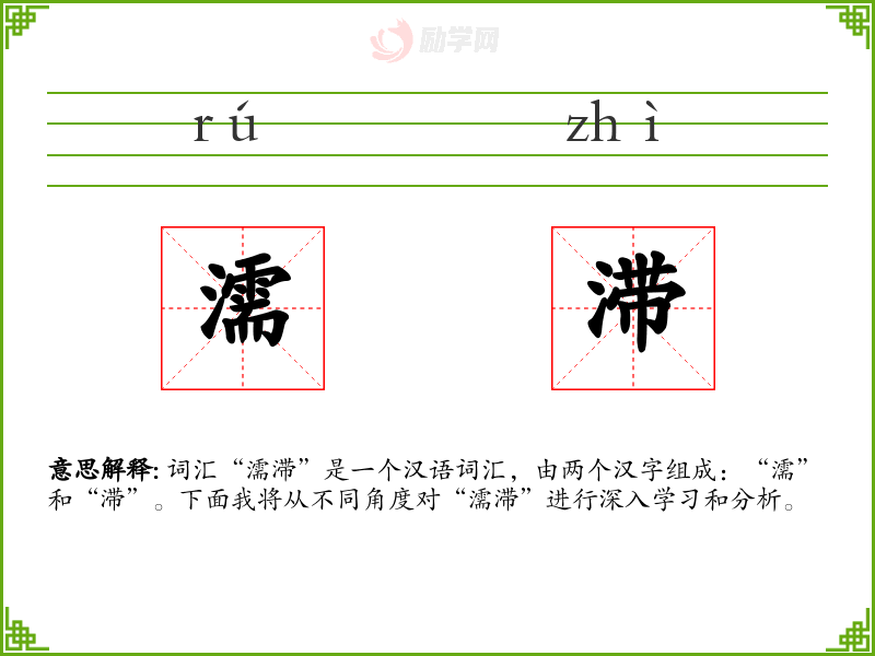 “濡”字古汉语中意为湿润,“滞”字意为停滞。两个字组合起来,形成了描述湿润且停滞的状态的词汇。
