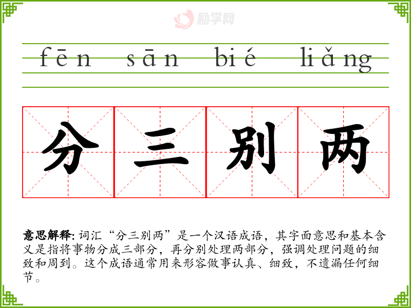 词汇“分三别两”是一个汉语成语,其字面意思和基本含义是指将事物分成三部分,再分别处理两部分,强调处理问题的细致和周到。这个成语通常用来形容做事认真、细致,不遗漏任何细节。