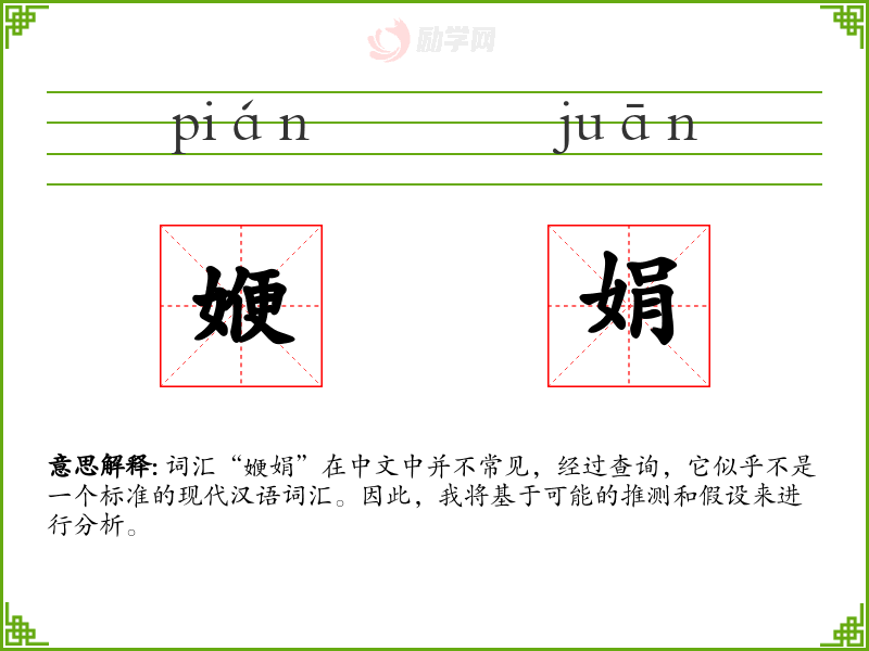 词汇“㛹娟”在中文中并不常见,经过查询,它似乎不是一个标准的现代汉语词汇。因此,我将基于可能的推测和假设来进行分析。