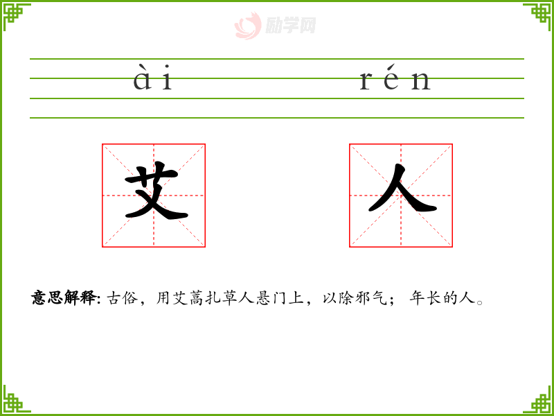 艾人的意思是:古俗,用艾蒿扎草人悬门上,以除邪气; 年长的人。