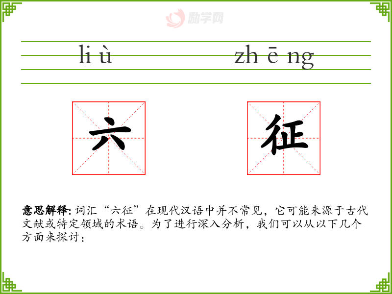 - 反义词:无(由于“六征”是一个特定术语,通常没有直接的反义词)